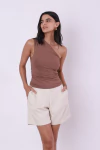 Blusa um ombro só, drapeado no ombro e na lateral do corpo. Feito em poliamida com elastano.